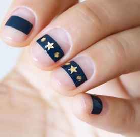 第四步:在食指、中指、无名指和小拇指上贴上铆钉质感贴纸,最后刷上亮油,照灯60秒这个款式就完成啦~~