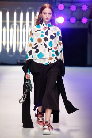 02 白色仿真丝,纯净高雅。色彩丰富的几何图案,大小错落,方向错落,泼墨画般的艺术气息。衬衣的立领设计,宫廷复古风格,增添整体的高贵上品感。